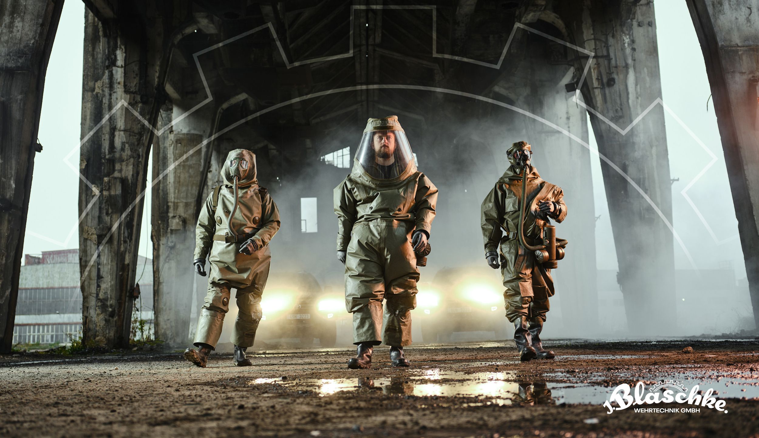 Our NBC‑Suits are heavy, impermeable, reusable, decontaminable, gas-tight protective suits designed for military use.