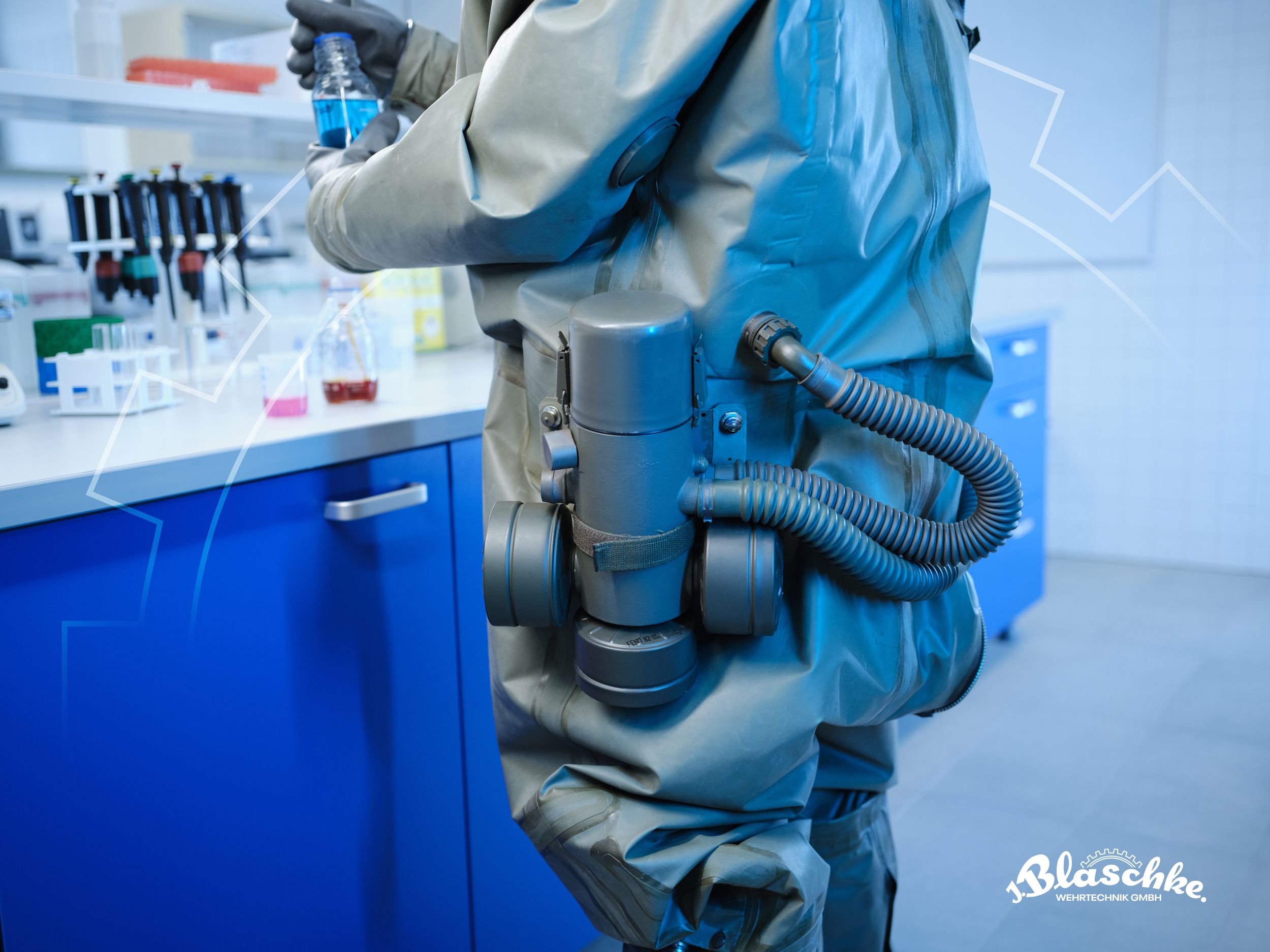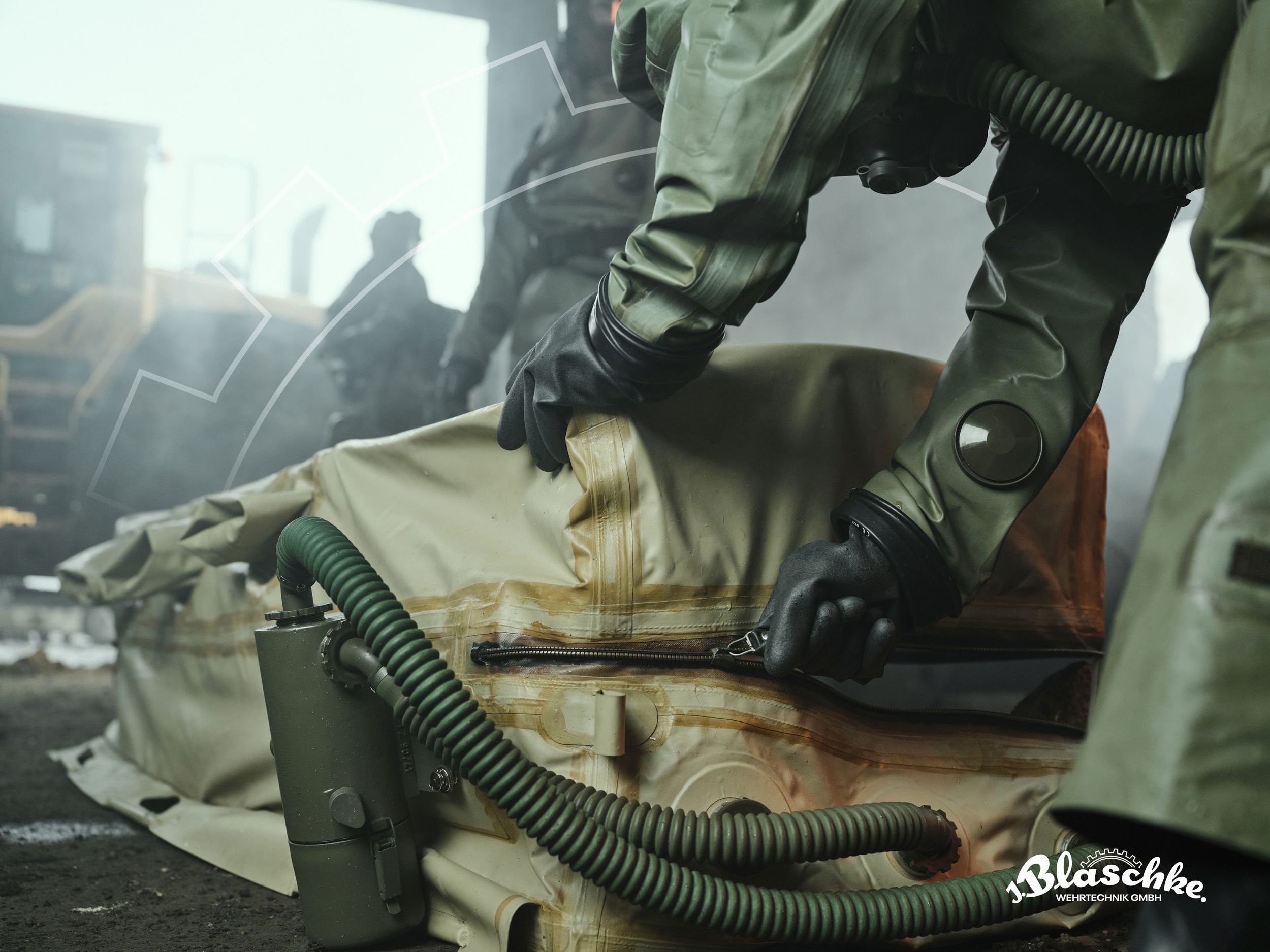 Our suits can be equipped with an integrated 3 litre NBC‑resistant drinking water bladder pocket at the back of the suit. The main feature of this integrated bag is that no additional bag and carrying harness is needed (standard carrying systems cannot be decontaminated).