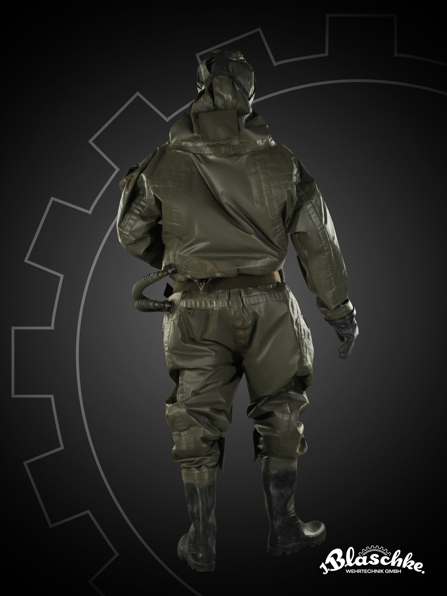 Der ABC‑Einteiler ist ein schwerer, undurchlässiger, wiederverwendbarer, dekontaminierbarer, gasdichter Schutzanzug, der mit einem Reißverschluss geöffnet/geschlossen wird.