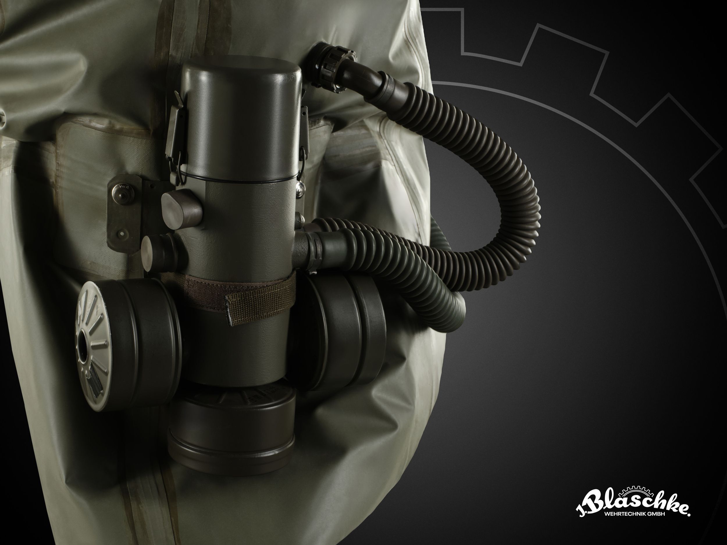 Das Belüftungsgerät filtert die Umgebungsluft durch drei herkömmliche NATO-kompatible ABC-Atemschutzfilter, wodurch keine speziellen zusätzlichen Filter erforderlich sind.